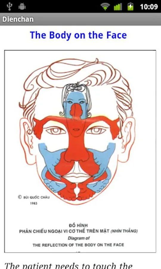 The mission of this application is to further promote and educate the public on the present and immediate benefits of an amazing method of treatment from Vietnam - Dien Chan (Facial Reflexology), which makes it possible to anyone to discover and develop a part of the enormous potential for self-healing and self-regulation well hidden within his or her own self.