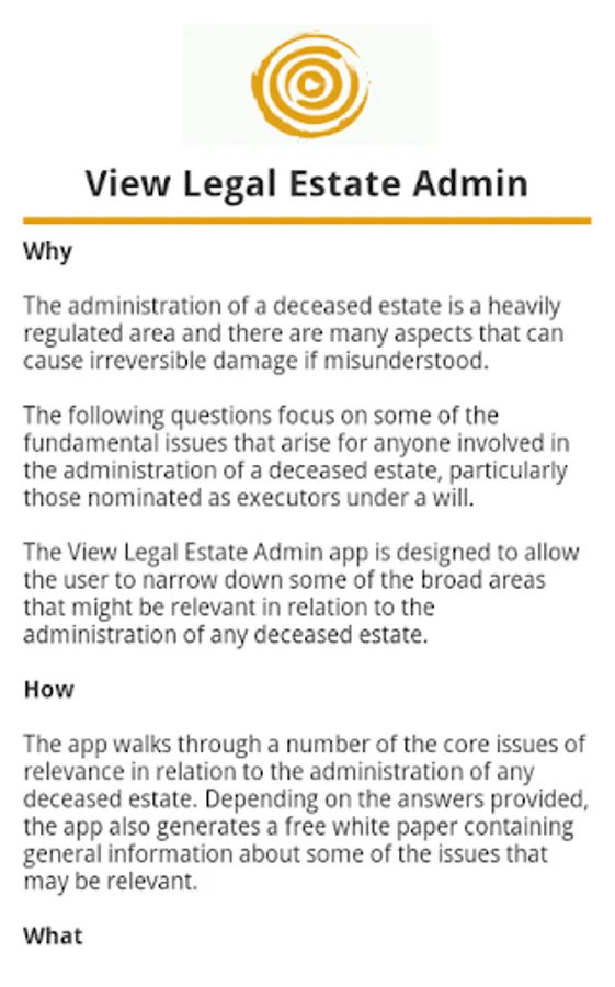The View Legal Estate Admin app is designed to allow the user to narrow down some of the broad areas that might be relevant in relation to the administration of any deceased estate.