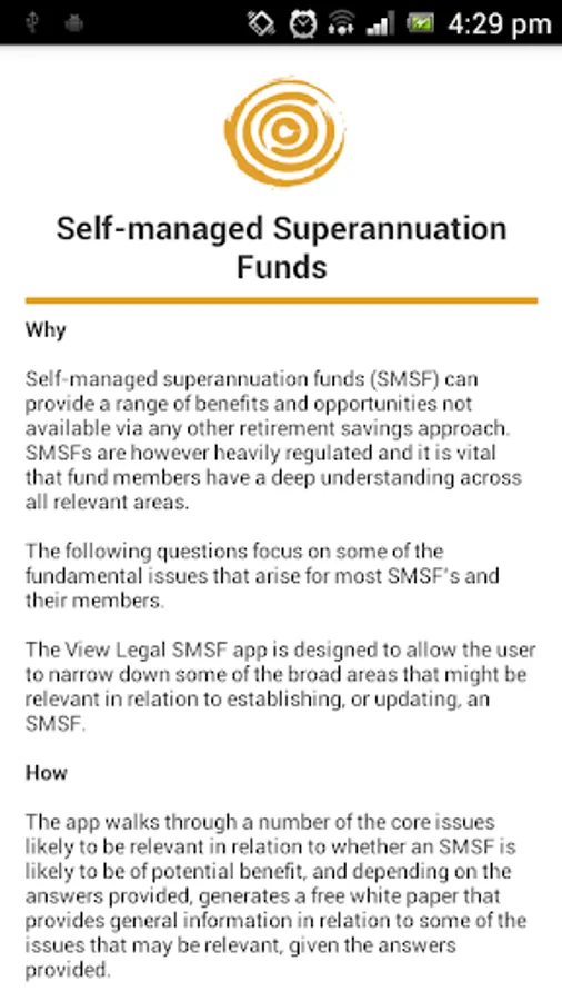 The app walks through a number of the core issues likely to be relevant in relation to whether an SMSF is likely to be of potential benefit, and depending on the answers provided, generates a free white paper that provides general information in relation to some of the issues that may be relevant, given the answers provided.