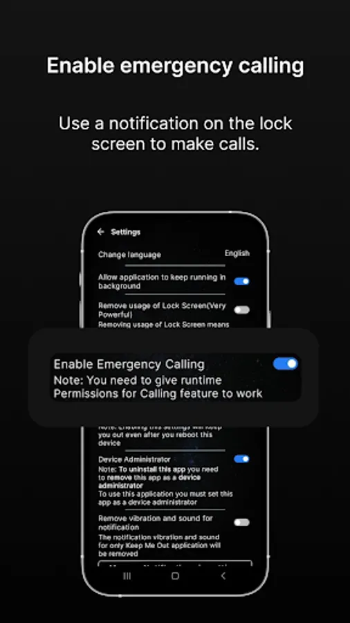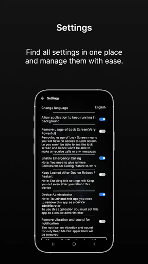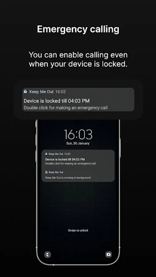 The core function of our application. Just choose a period of time and lock yourself out. Emergency contacts can be enabled from the settings screen.