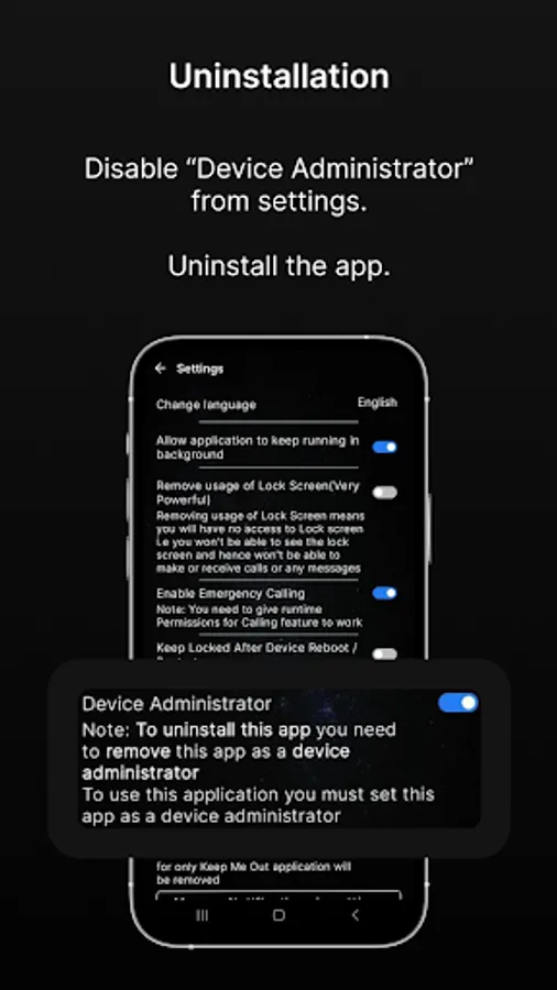 Find all important settings concerning uninstall, device reboot, connected device settings, as well as language settings in one place.