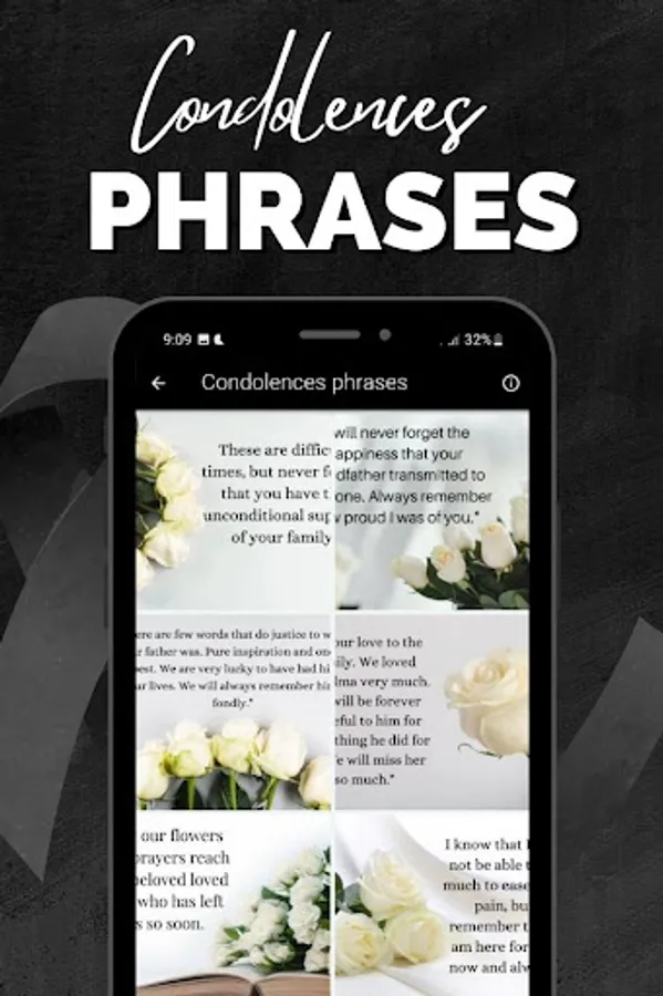 These phrases are what you can find in our application: phrases of consolation, messages of condolence, support in mourning, overcoming the loss, comforting words, inspiration in pain, remembering loved ones, emotional accompaniment, reflections in grief, strength in difficult times.