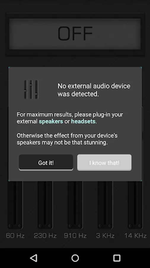 Boost your device's sound quality with this easy to use 5 band Equalizer and make it sounds like a HiFi system.