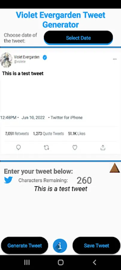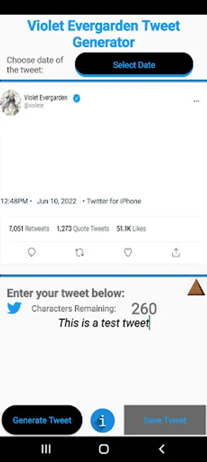 This simple app lets you choose a date and a customized twitter message and creates a meme that looks as though Violet Evergarden tweeted the message.