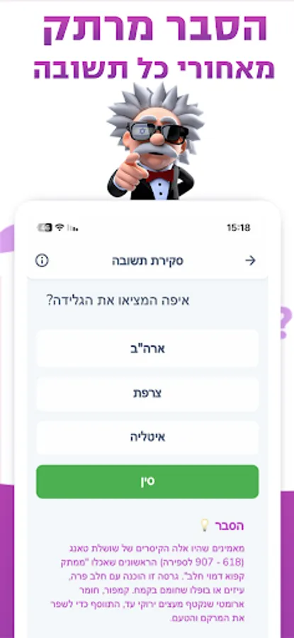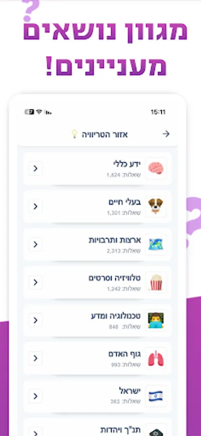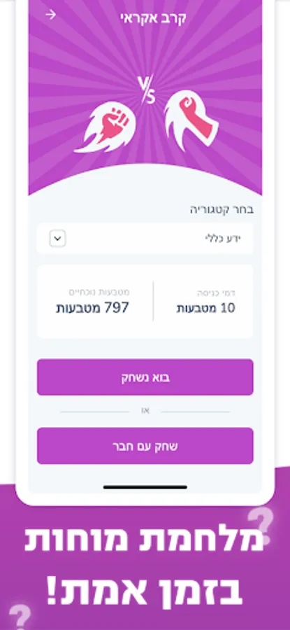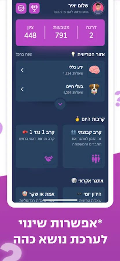 Don't miss the opportunity to hang out in fascinating brain battles that will surprise you at any moment. Play against old and new friends, choose the trivia topics you want to tackle, and get on top of the leaderboard. Will you manage to be the leader of the score table, break records and show everyone that you are the boss of Hebrew trivia in the State of Israel?