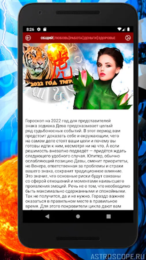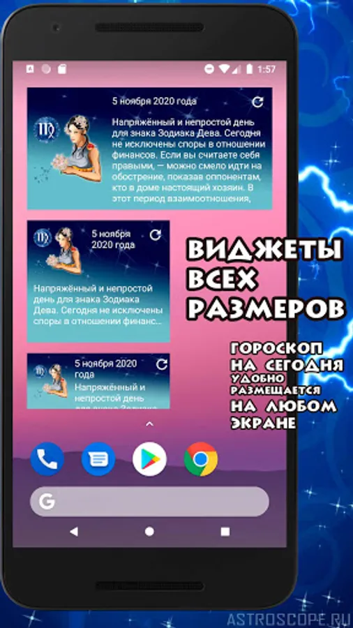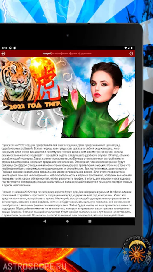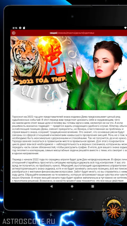Many Virgos will certainly be able to appreciate the useful option of this application, like a video horoscope - an audiovisual presentation of the astrological forecast for the current period for Virgo (for people in whose life comfort and convenience are almost at the forefront). And one more bonus. By installing a free application on their smartphone, Virgos get the opportunity to fix the horoscope widget for every day on the main screen of their device, as well as tiling colorful wallpapers. For many Virgos, the image of your zodiac sign on the phone screen will add confidence that now you will always have a talisman with you that attracts good luck.