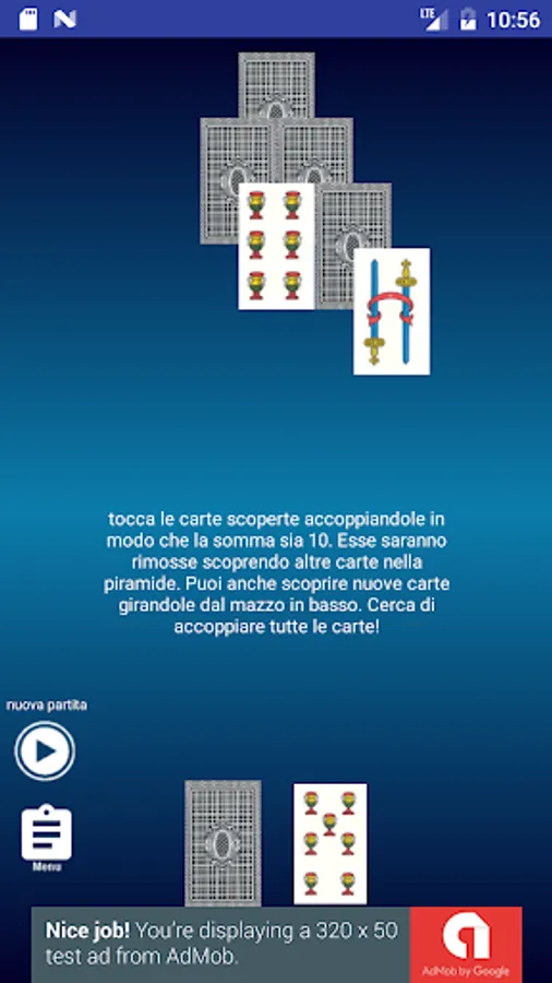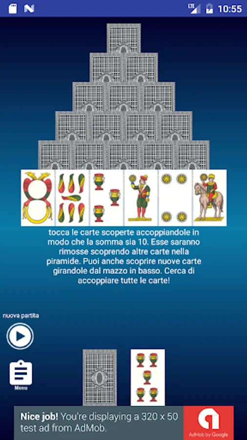 Tap the cards matched pairs so that the sum is 10. They will be removed discovering other cards in the pyramid. You can also discover new turning cards from the lower deck. Tries to match all the cards!