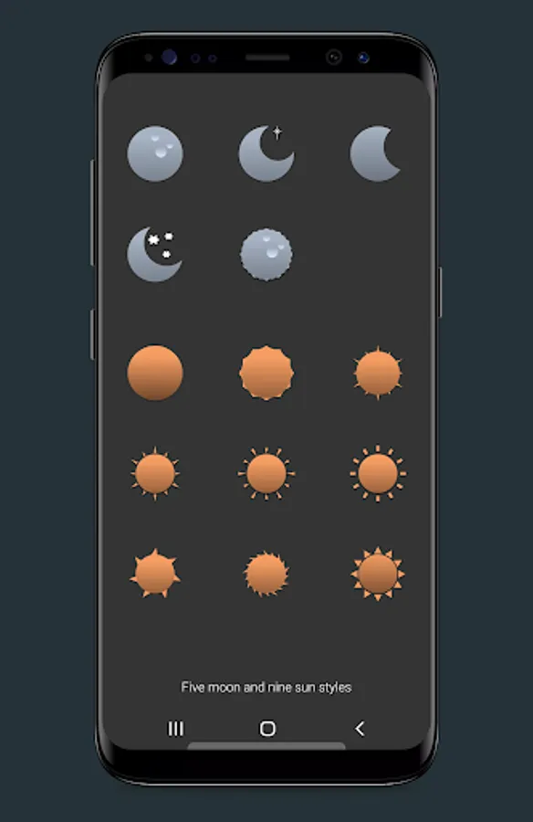 Includes the usual User settings plus choice of 9 sun and 5 moon styles with color settings for Day(sun) and Nite (moon), clouds, rain, wind, snow, hail,