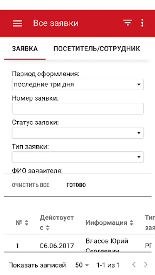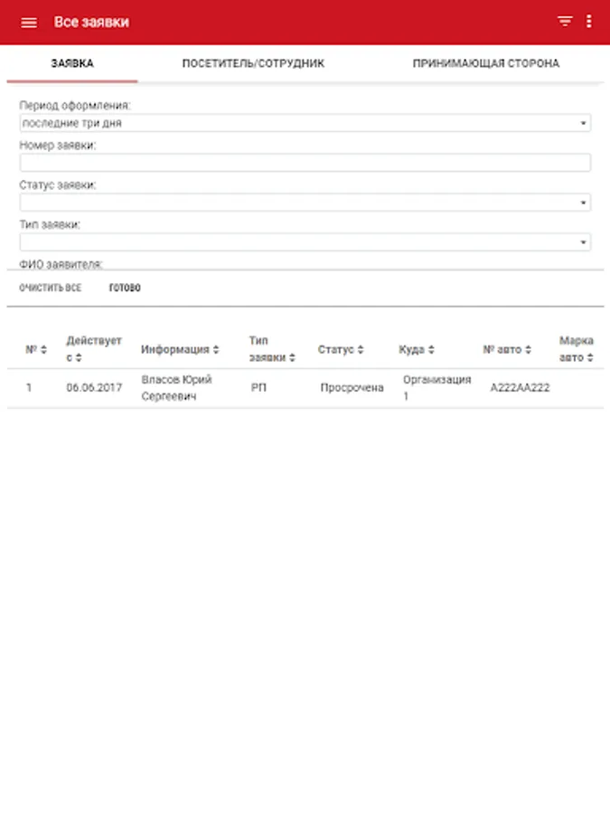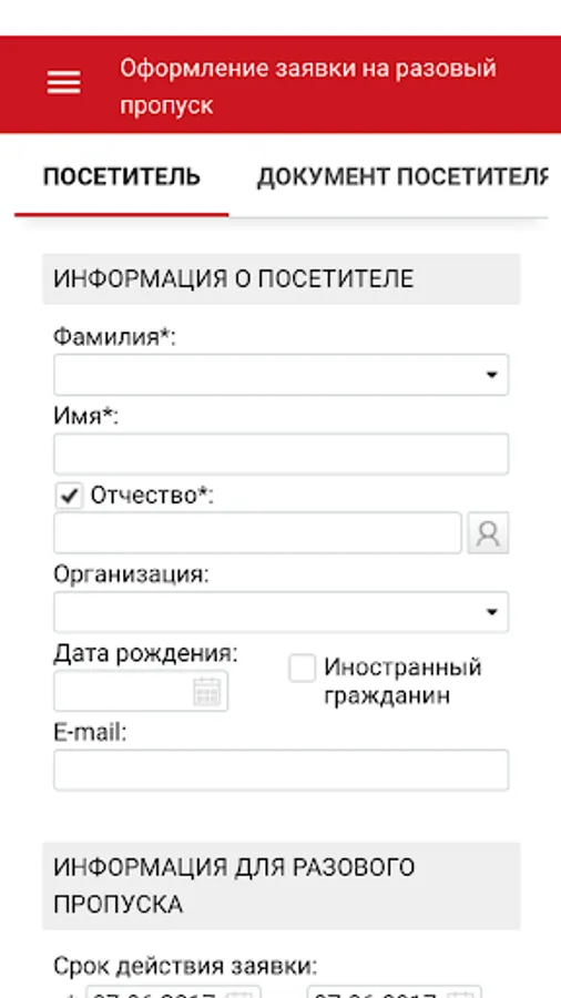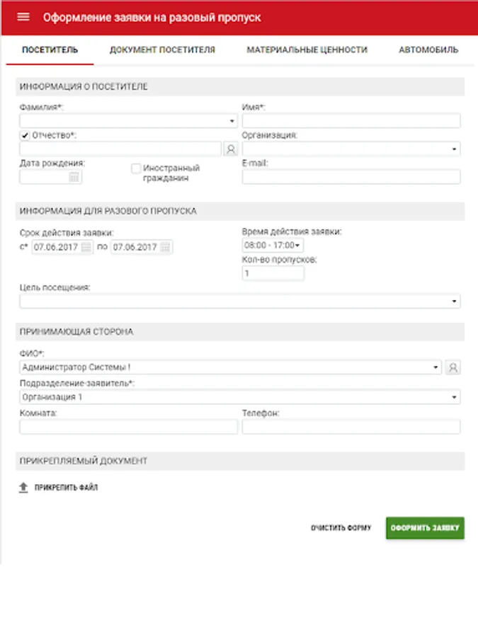 • create an application for a one-time pass for a visitor indicating the date or period of validity of the pass, the visitor's company, as well as the make and number of his car;
