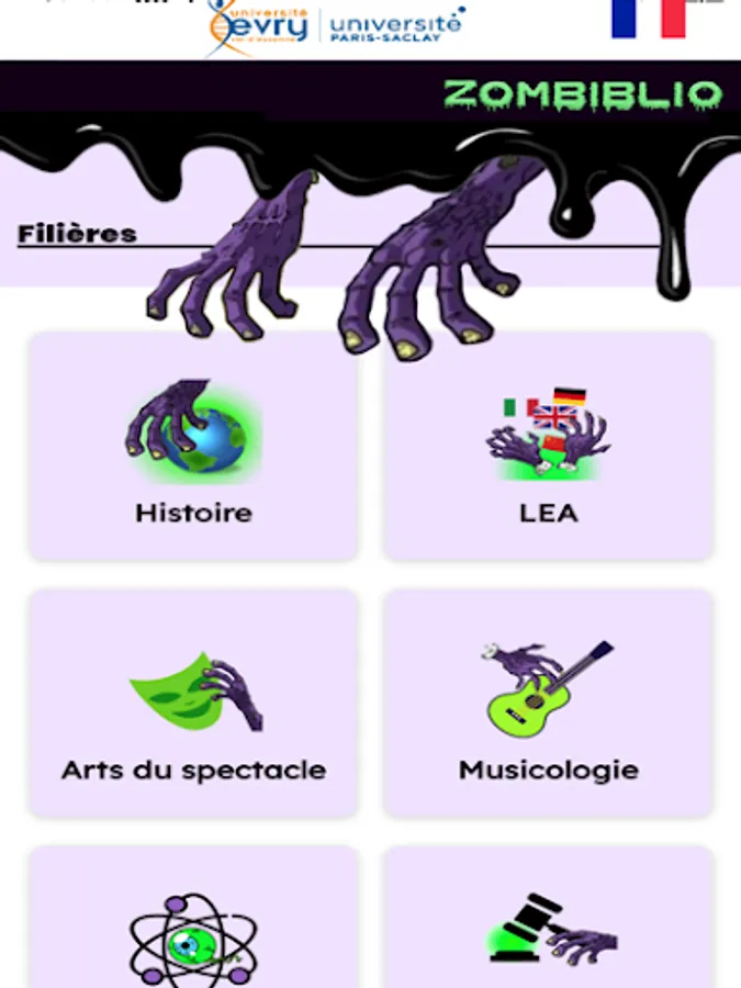 The objective of the Zombiblio BU Evry game is to introduce, on tablet or smartphone, the campus library to newcomer students (first year of license or IUT), for the Paris-Saclay University Library network.