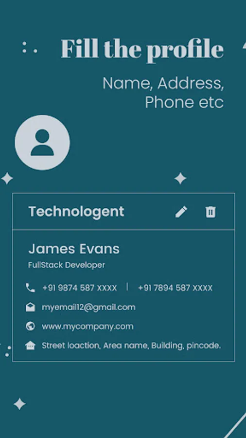Firstly you have to add the details like company name, owner name, profession title, mobile number, phone number, E-mail, website, and address and add the the logo of company or business. Can select the logo from the phone's gallery. Create multiple profiles and manage them to create visiting & business cards.