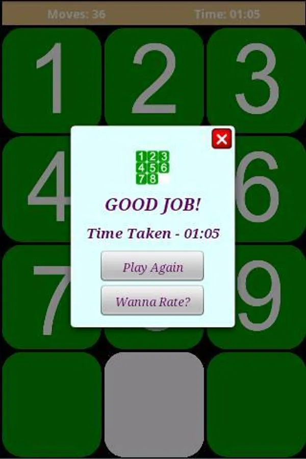 The classic sliding tile game or puzzle 9 game offers you to try your brain in this well known game. A fun and addictive sliding puzzle game. It's also called Gem Puzzle, Boss Puzzle, Game of nine. The object of the puzzle is to place the tiles in order by making moves using the empty space.