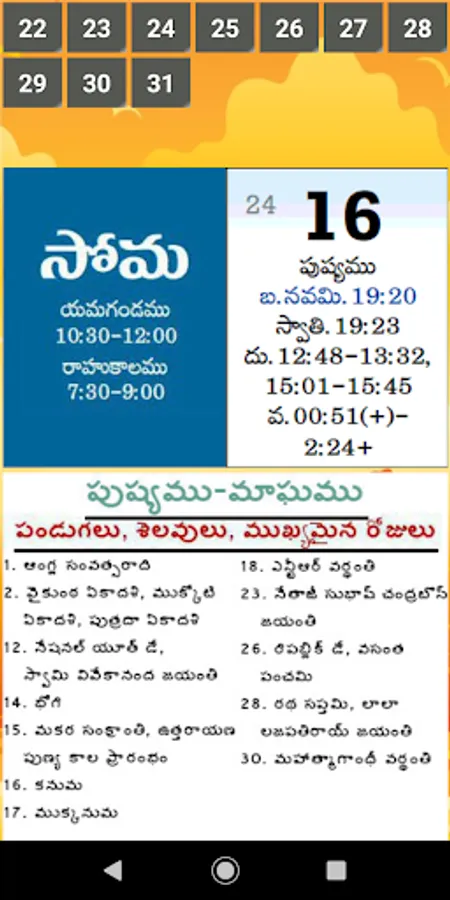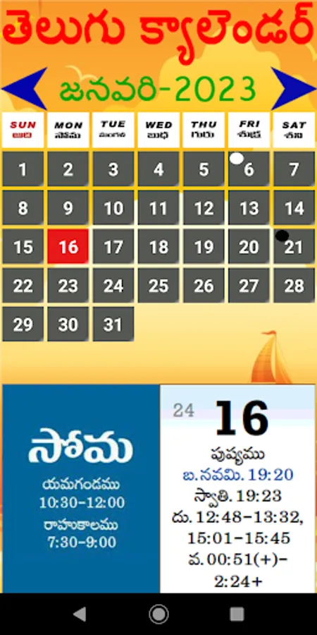 - Provides an option to choose a date in 2023 to get vaaram, thithi, nakshatram, raahu kalam, and durmuhoortham information