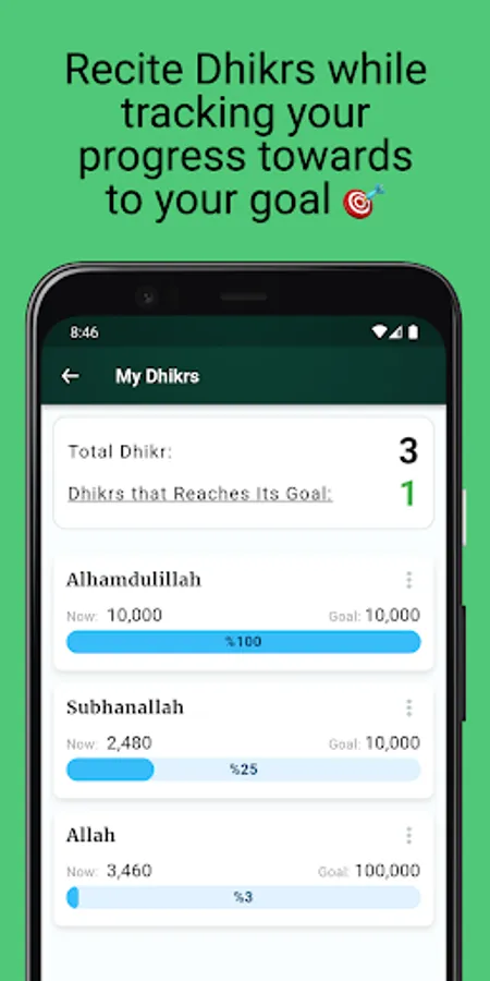 ✪ Being able to observe and monitor how much you have reached your target number for your Tasbeeh and dhikr. You can do this thanks to the My Dhikrs/Tasbeeh list.
