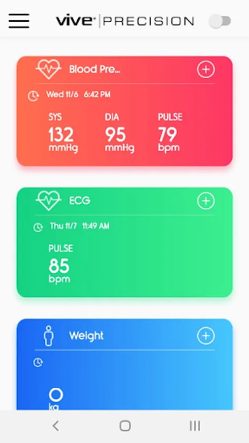 With the Vive Precision app, you can effortlessly track a range of essential health metrics, including weight, ECG, blood pressure, and more. All your vital sign data is consolidated and easily accessible on a single platform, allowing you to gain valuable insights into your overall well-being.