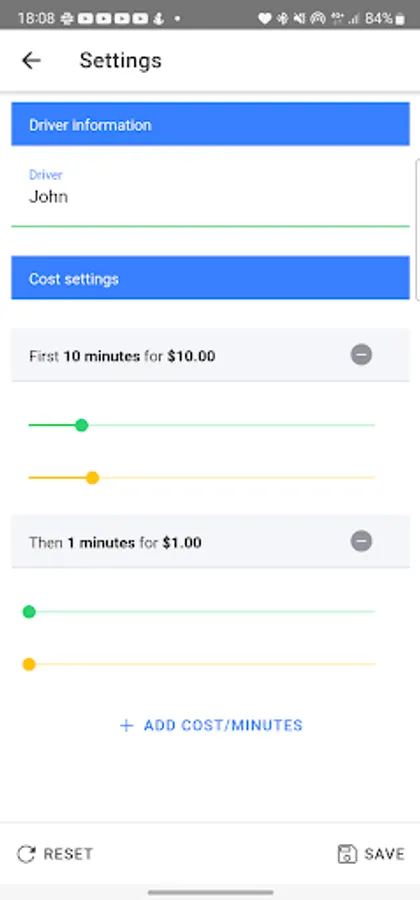Settings gives users the ability to set the driver's name as well as two time levels for charging riders. For example, they can set a charge of $15 for the first 10 min of a ride and then $1 per minute after that.