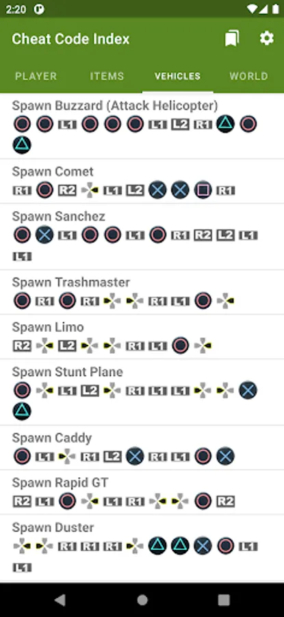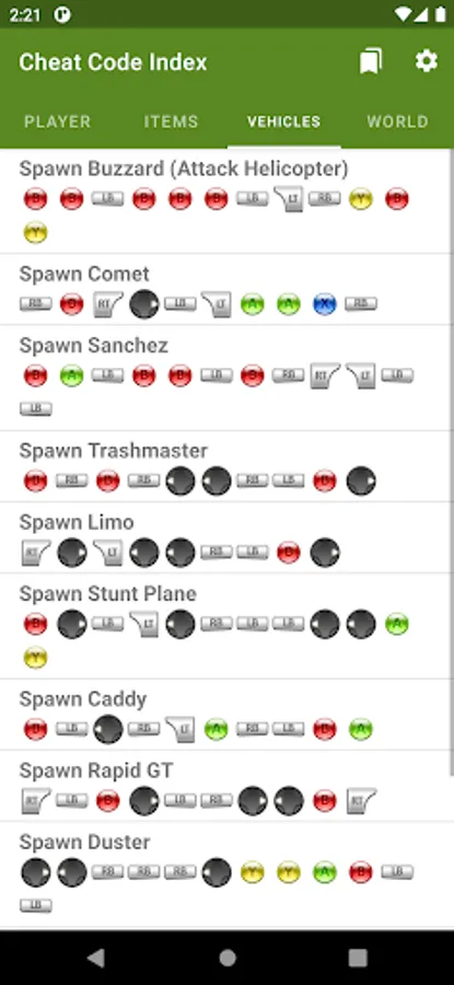 All 31 cheat codes for the game are available. This app only contains codes for version 5 of a specific car/auto theft game. The cheats are grouped by category (Player, Items, Vehicles, World). The app provides a 'Favorites' feature.