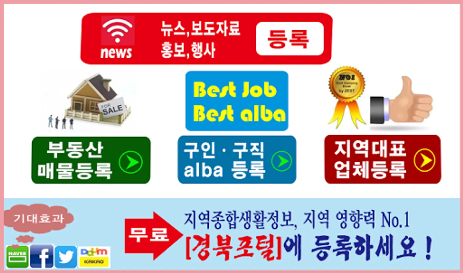 Gyeongbuk, the portal to the latest news, politicians, registration and real estate for sale searches, business registration Job search, used cars for sale, services Points Of Interest Tourist attractions, restaurants, etc. Living Information about Gyeongsangbuk-do region.