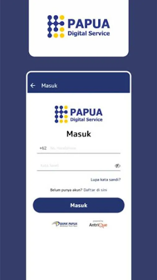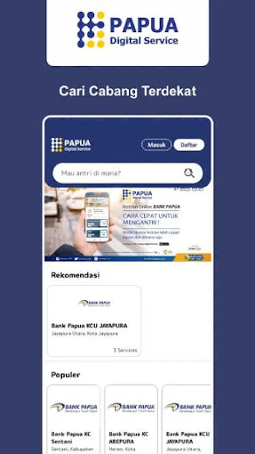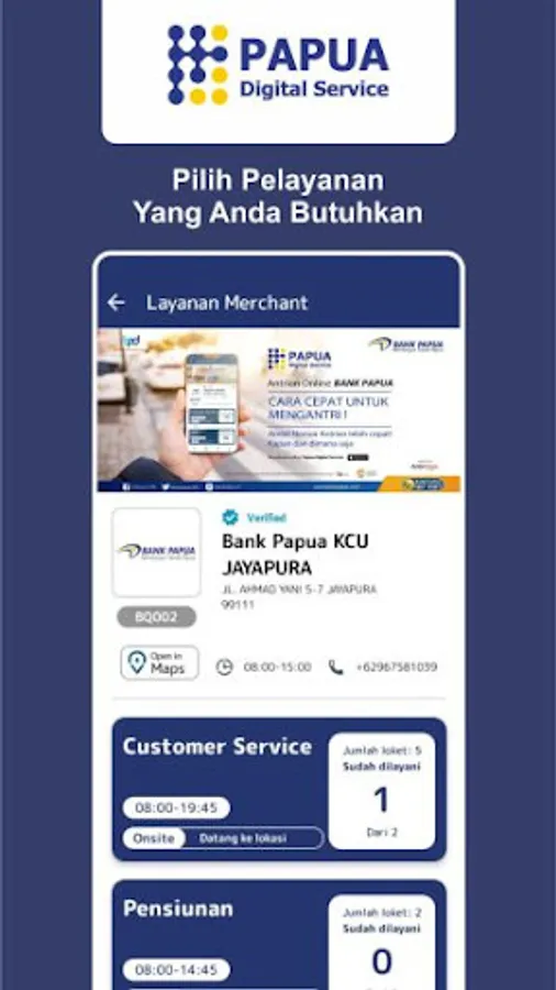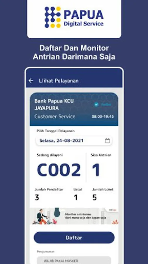 Papua Digital Service is an Online Queue Service that can be used by customers to retrieve and monitor queue numbers at Bank Papua Branch Offices. This application can help customers take queue numbers anywhere and anytime without having to come to the Branch Office.