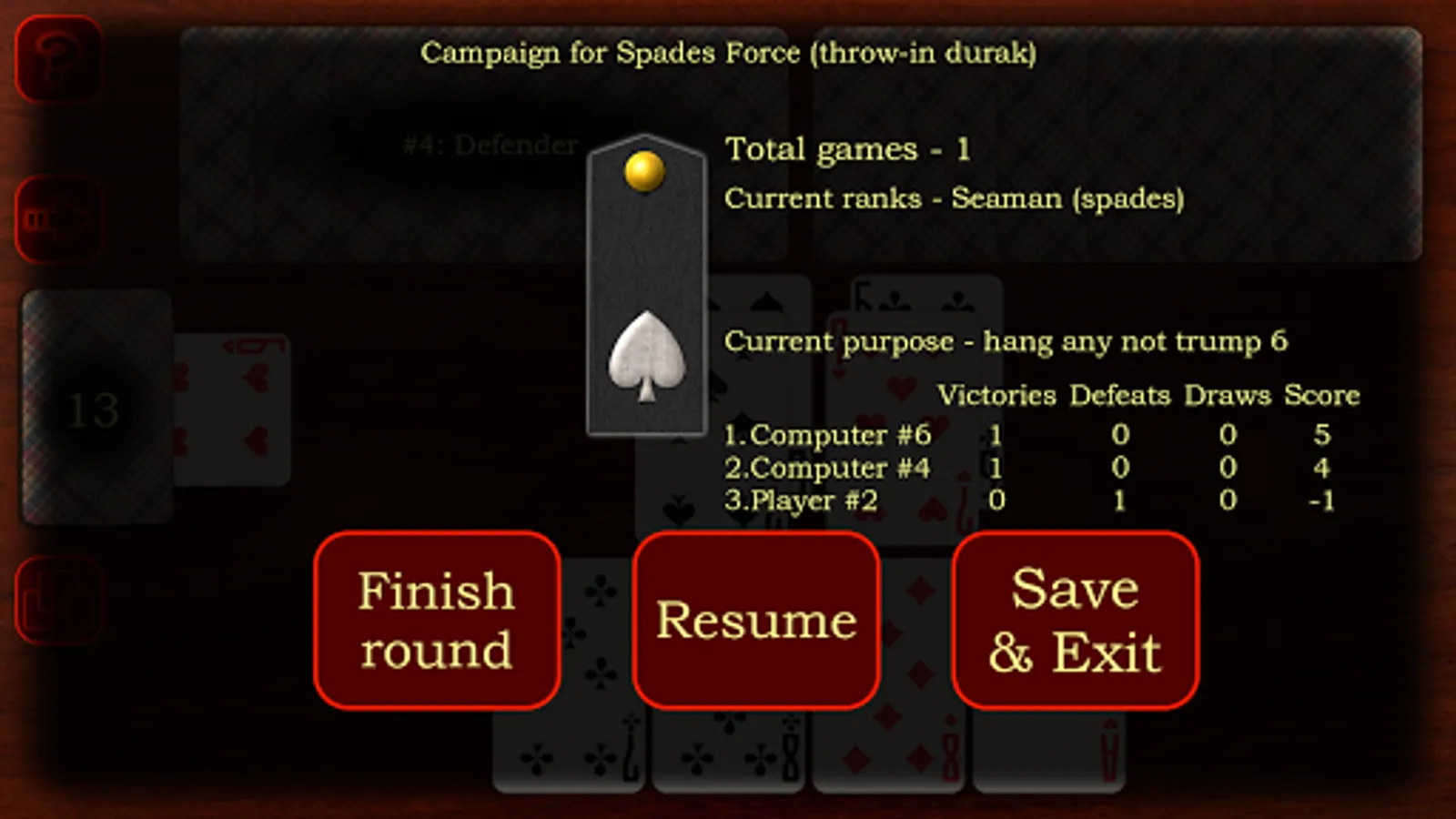 The main feature of the game durak thrown-in, passing is a enough strong artificial intelligence that will not let you get bored for many parties. This algorithm has already appreciated by many users of the game durak. Some people liked it so much that they compare it to the algorithm with a live person.