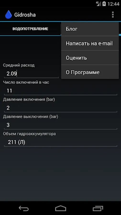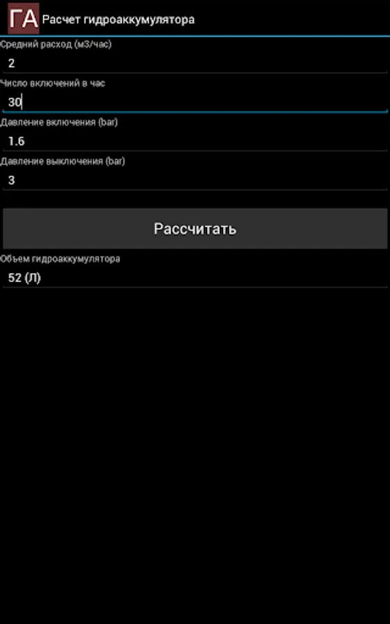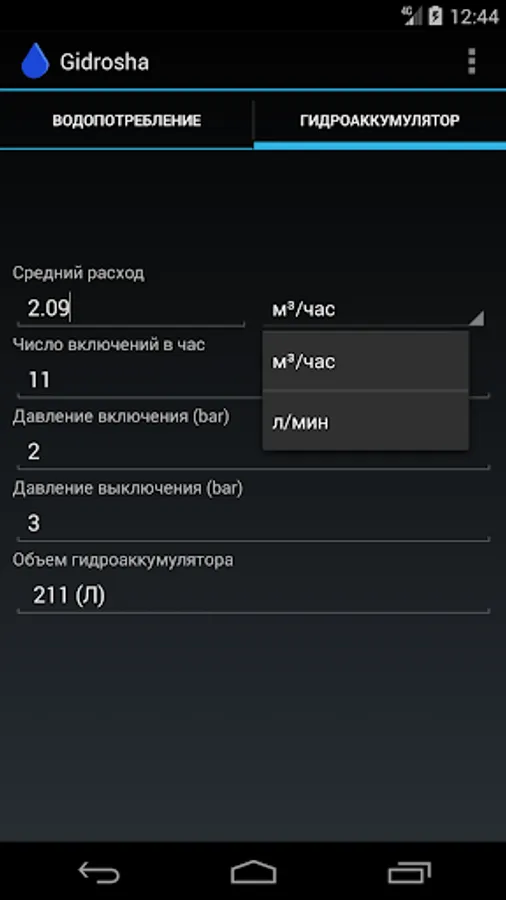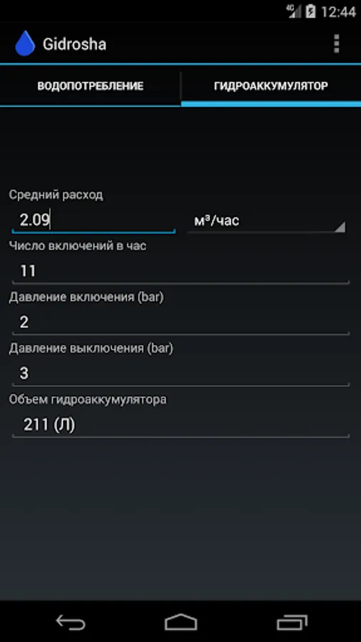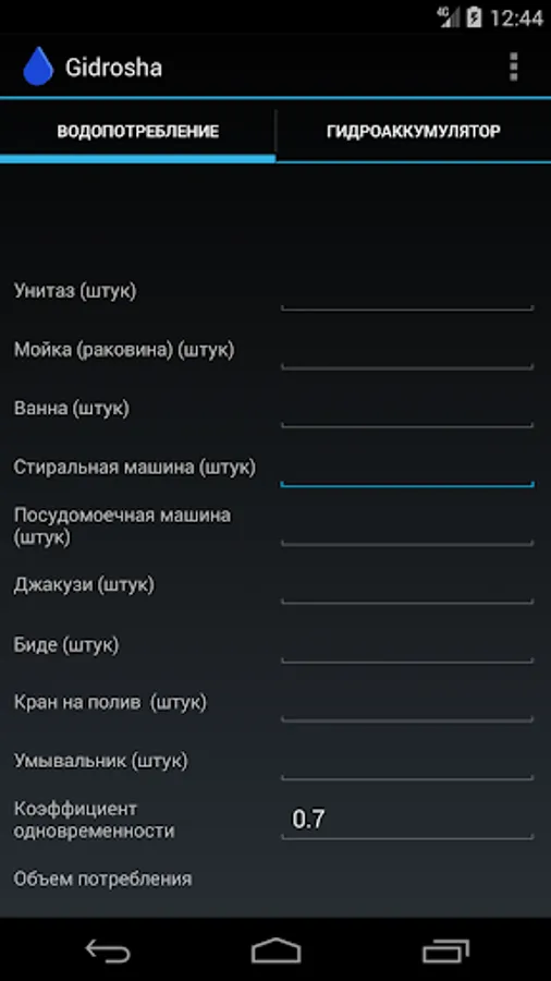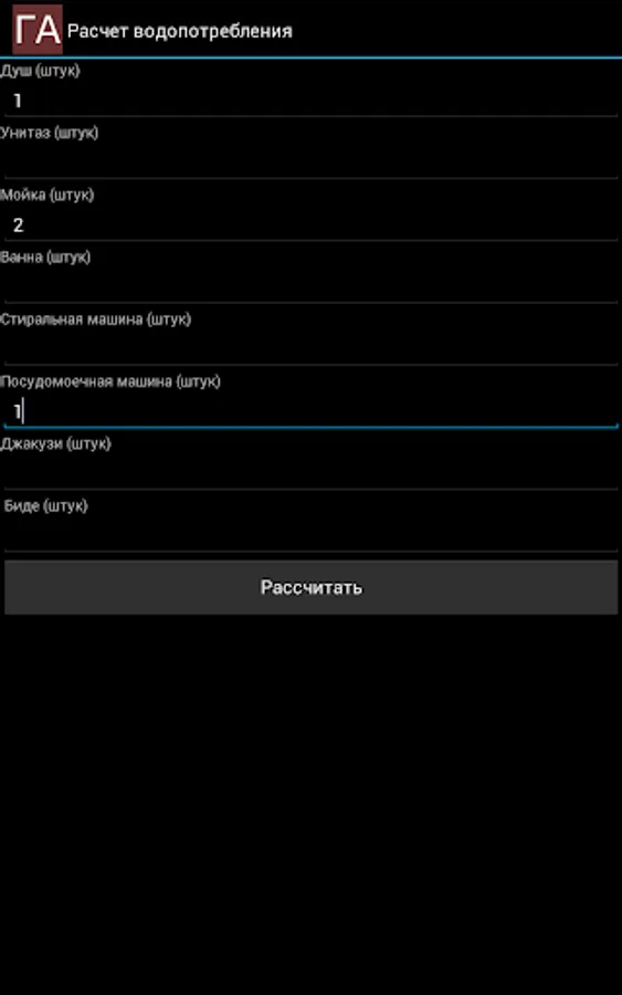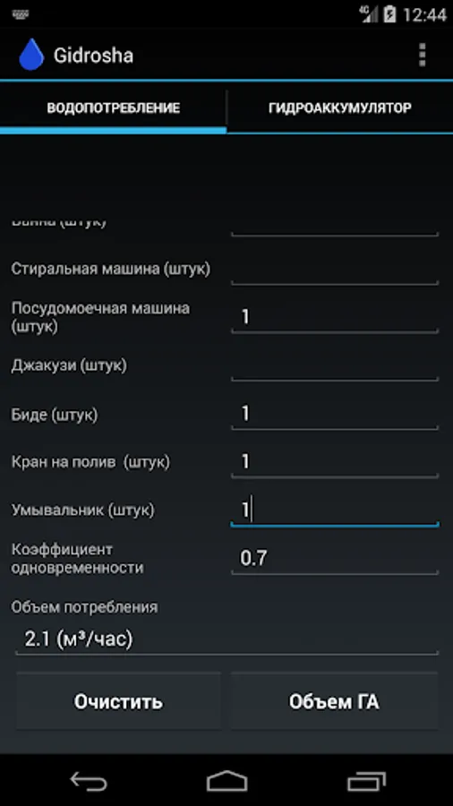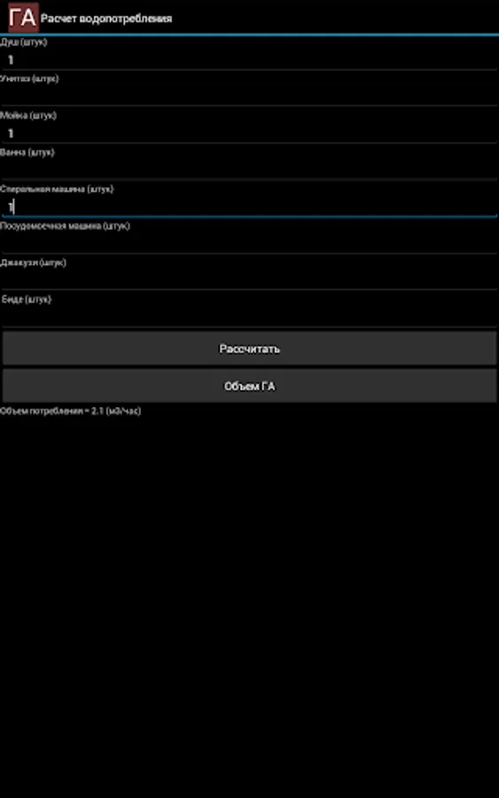 With Gidrosha application, you can calculate the water consumption needed for the normal operation of plumbing fixtures in a house, an apartment, a garden house, and other buildings.