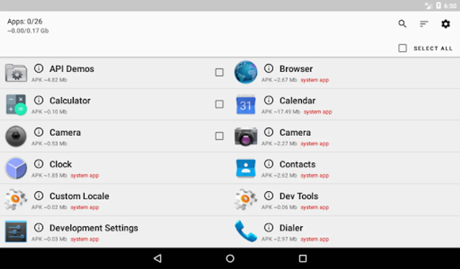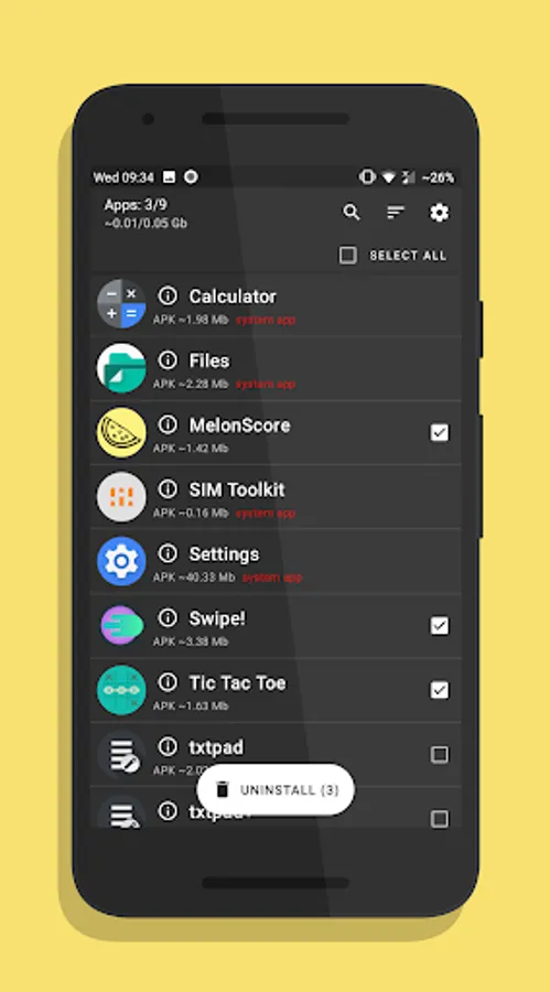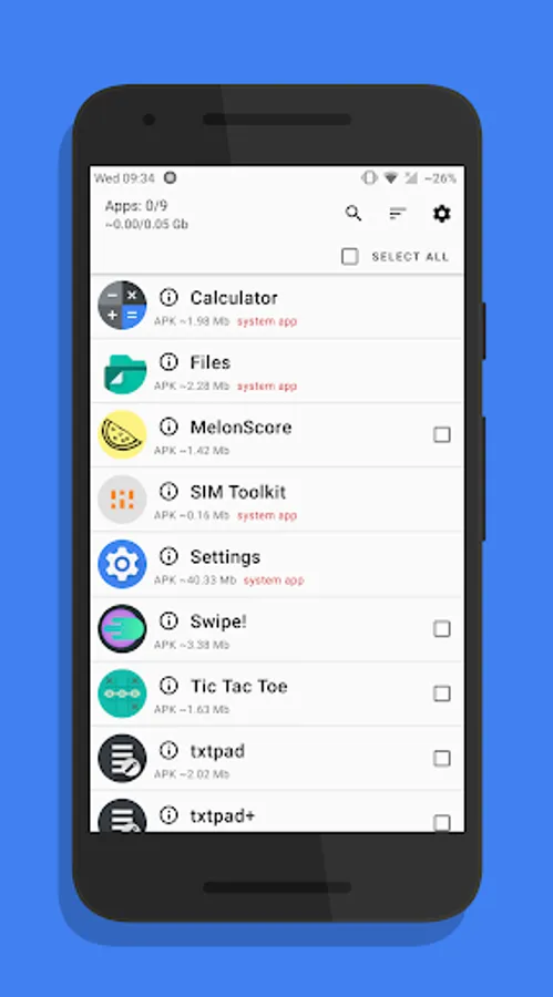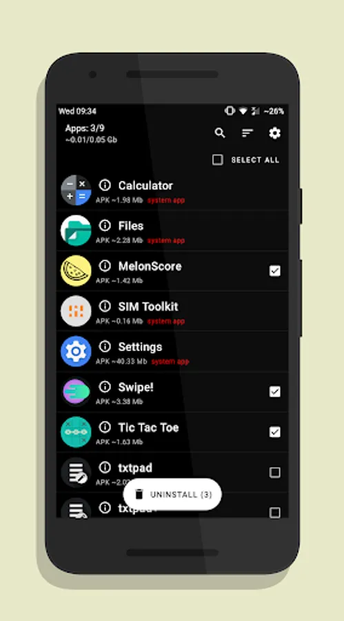 You can use the search to find the apps you want to uninstall. You can sort apps by the size of their APKs or by their name in ascending order and descending order. You can select apps using a checkbox one by one or you can select all your apps using the checkbox at the top.