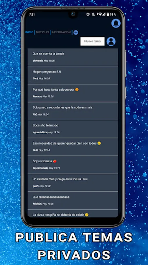 - Private topics: In this section you can make posts (text) completely anonymously, you can use it to vent or just express what you feel.