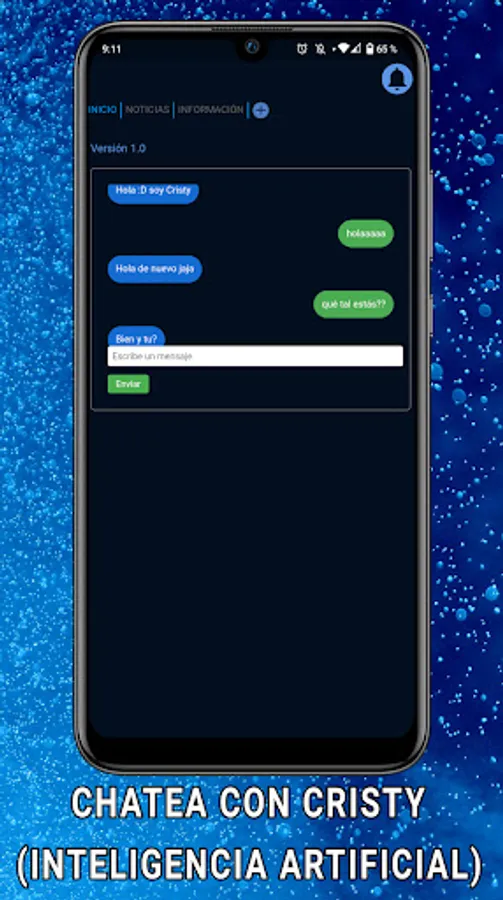 - Chat: In this section you can chat with Cristy, our artificial intelligence, as if you were chatting with a real person, the advantage is that it will never leave you unseen ;) you can use it unlimited and completely free.