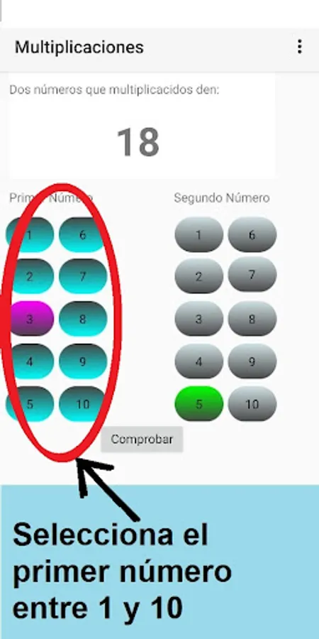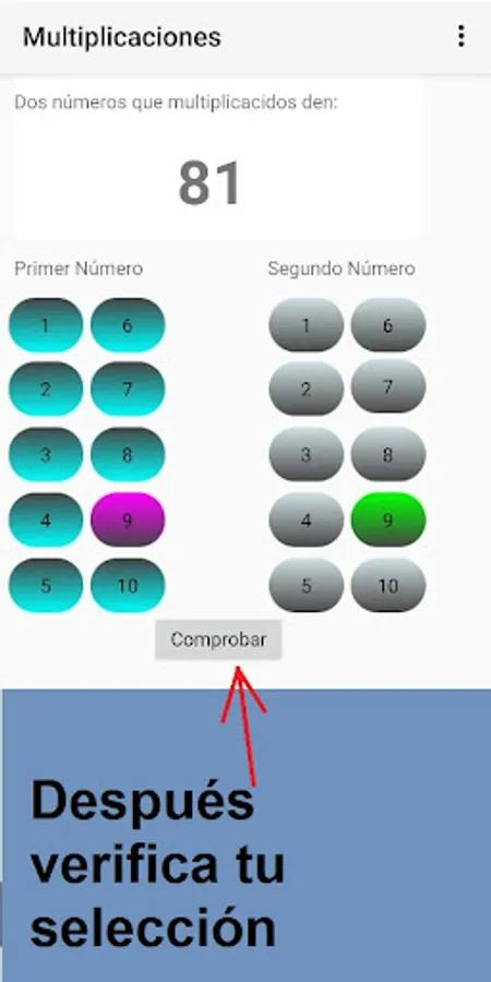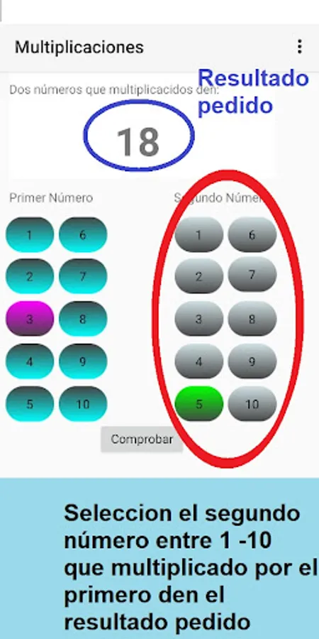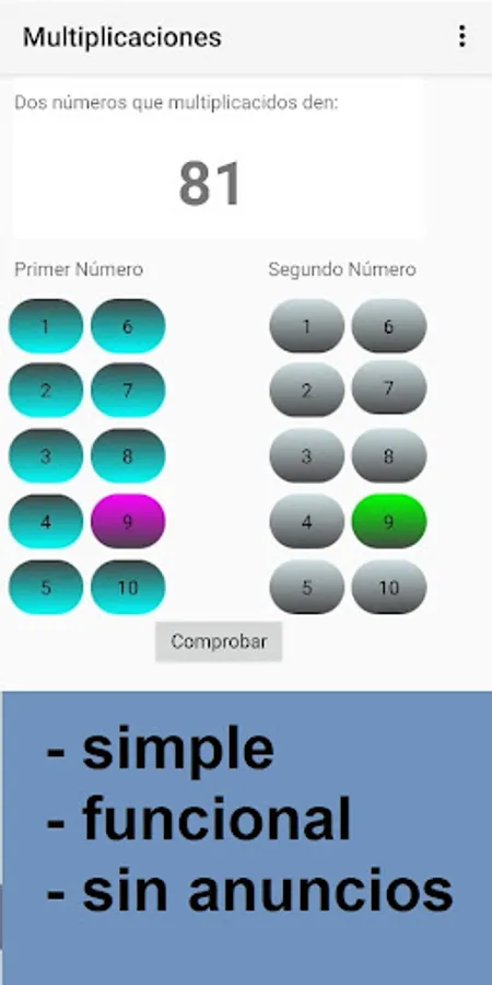 Simple application, easy to use, without ads. It asks you to find TWO numbers that multiplied are equal to the requested result. The numbers must be between 1 - 10. the number of exercises is without limits, it does not have a hit counter, not a time counter, it is made in a simple way.