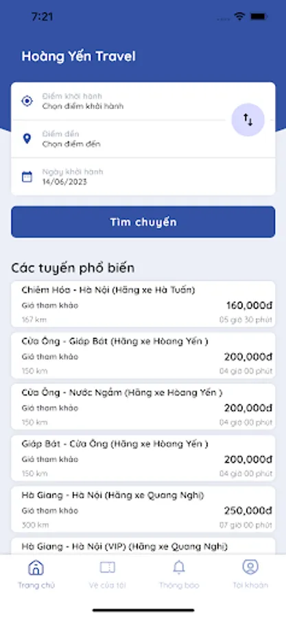 Booking application of Hoang Yen Travel company, booking online tickets for routes from Hanoi to Chiem Hoa, Ha Giang, Lai Chau, Ham Yen,... booking tours, contract cars, freight, ..