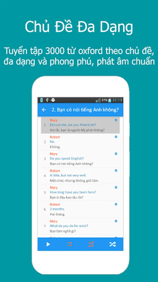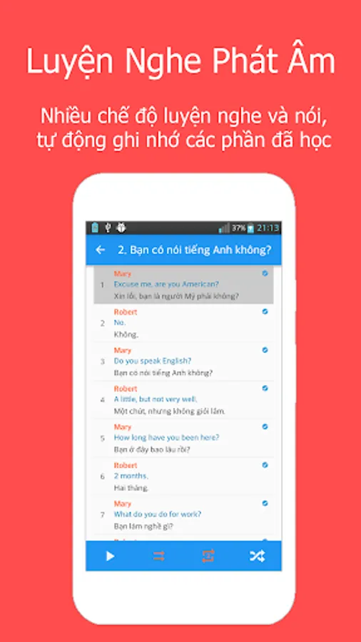 "Luyện nghe tiếng anh giao tiếp cơ bản 2021" là phần mềm giúp rèn luyện kỹ năng nghe một cách hoàn thiện hơn. Phần mềm học tiếng Anh tốt nhất trên Android, có đầy đủ những đoạn hội thoại từ cơ bản đến nâng cao, có phát âm, có bản dịch đầy đủ. Có thể sử dụng mà không cần kết nối mạng.