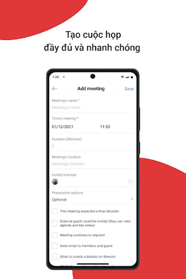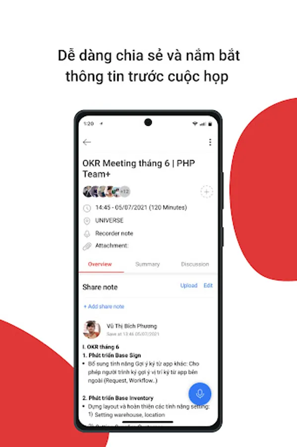 Base Meeting application with the ability to set flexible goals, processes, share, comment and request for each meeting helps to improve productivity of members in the meeting, most standardized information. consistent, clear. Support suitable for meetings in 2 formats: offline and online