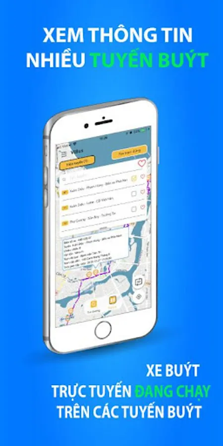 - Hỗ trợ hiển thị xe buýt đang chạy trực tuyến và trạm dừng trong vùng đang tìm kiếm trên bản đồ