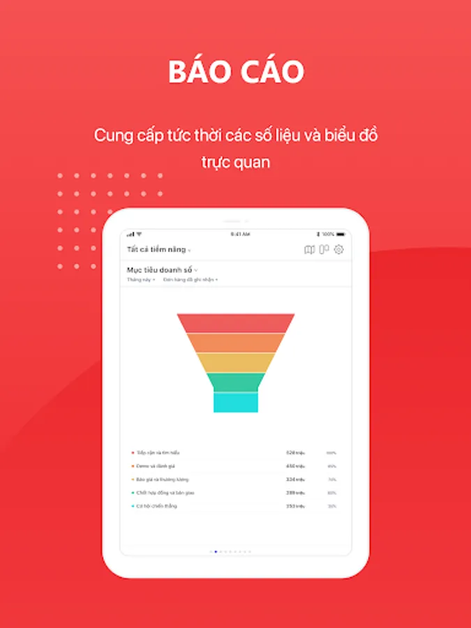 The software provides instant charts, analytical reports on sales, sales opportunities, debts... to help the Board of Directors make timely decisions and directions in operation.