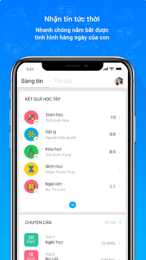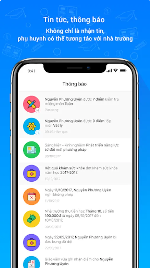 - Phụ huynh nhận ngay được các thông báo về điểm học các môn, thay đổi thời khóa biểu, có phát sinh các khoản tiền học phải nộp, sự cố thông báo về y tế...