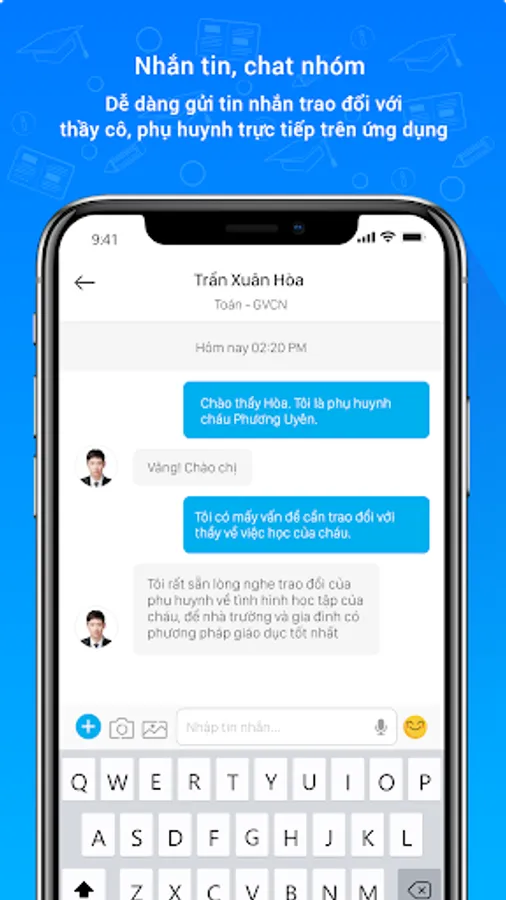 - Xem danh sách giáo viên của con mình, giáo viên dạy môn nào và thông tin chi tiết của giáo viên từ đó để trực tiếp trao đổi, lưu vào danh bạ, chat nhóm giữa phụ huynh và các giáo viên… một cách dễ dàng.