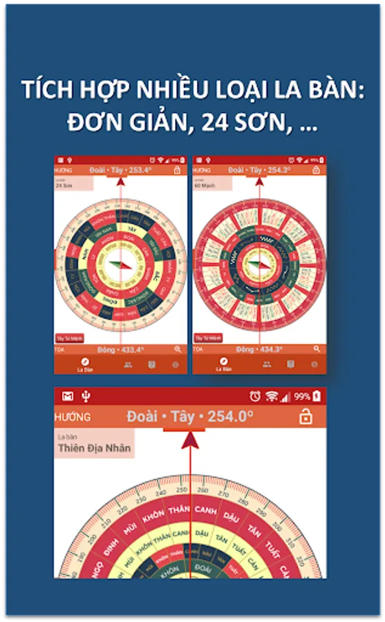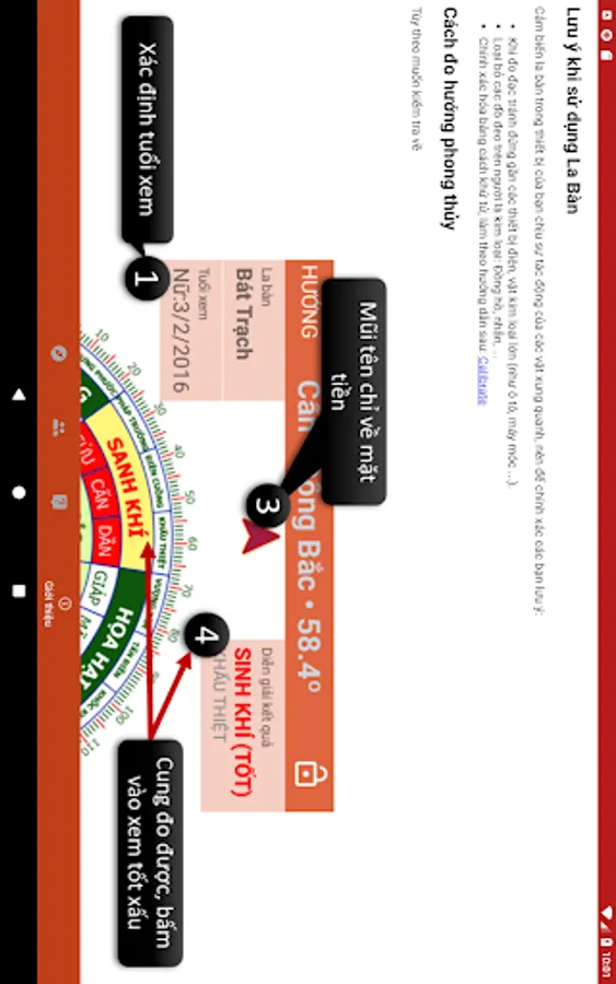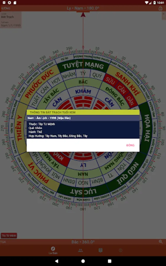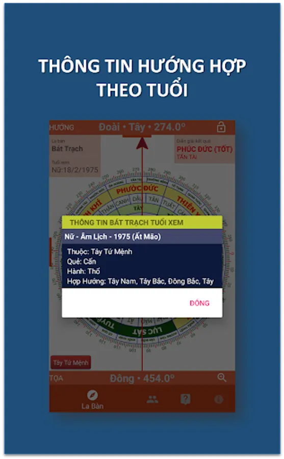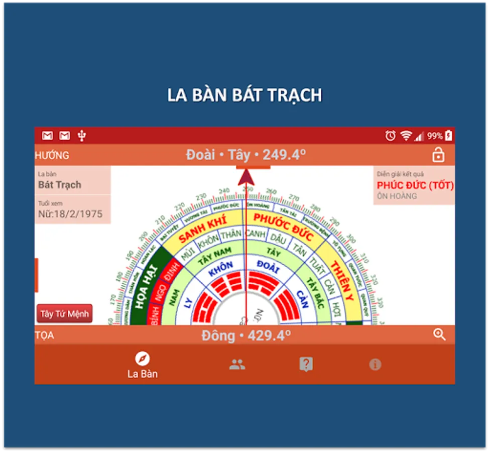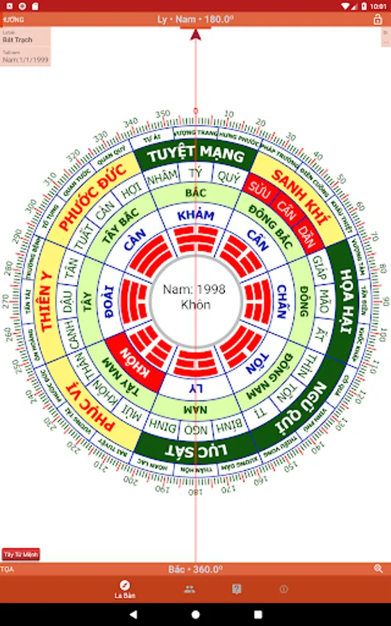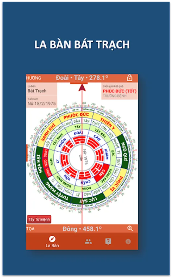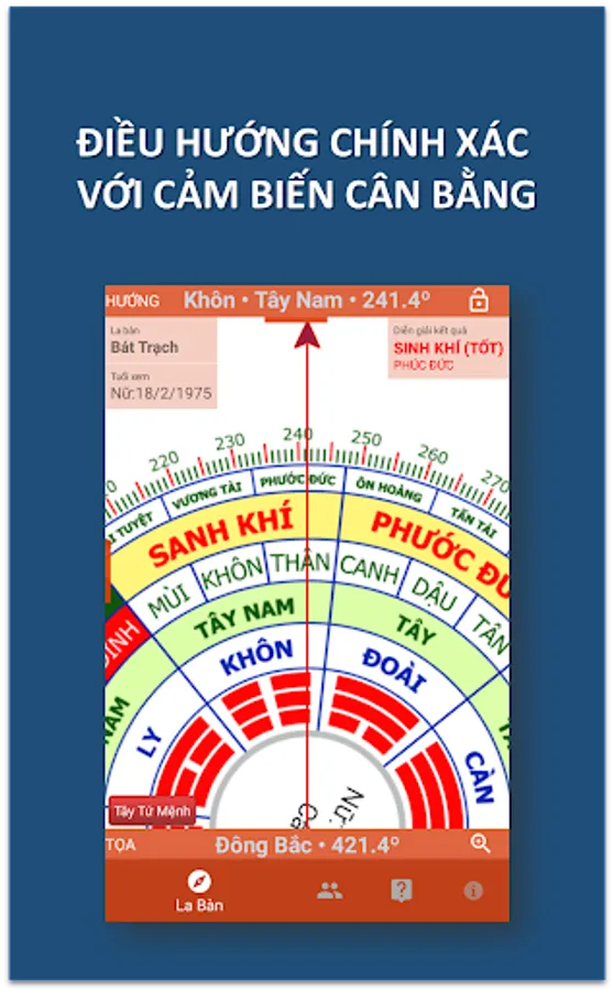 Compass Feng Shui (La business) applications using induction compass combined with the direction in Feng Shui, helps you measure the study of feng shui to determine the direction of good, overcoming the worse for themselves and in nail. Suitable for measuring the direction of the house, towards the door, towards the kitchen, workroom direction ...