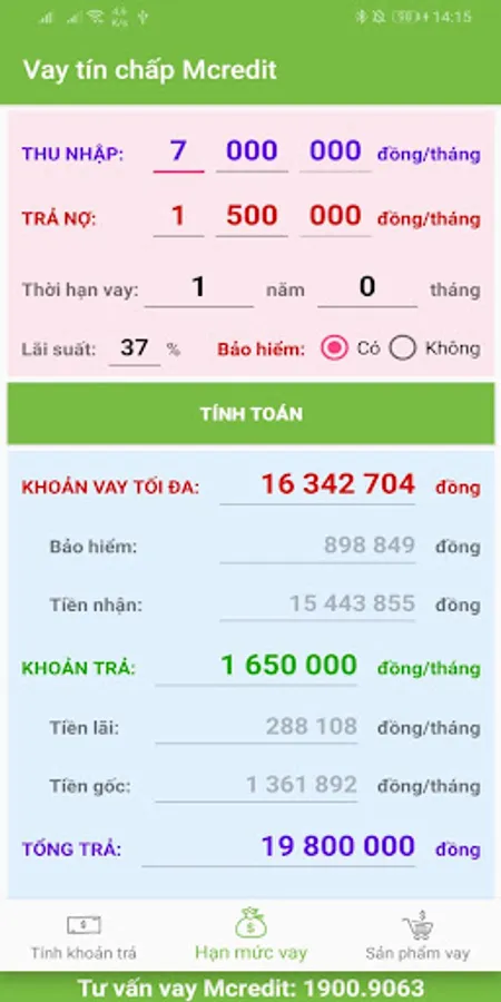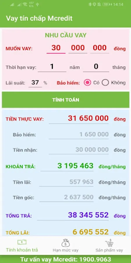 MCREDIT CREDIT COMPUTER is a tool to help people who are in need of credit loans (without collateral) at Mcredit self-calculate the monthly payment and the amount of interest arising for the desired loan, from there decide whether to accept the interest rate offered by the CI.