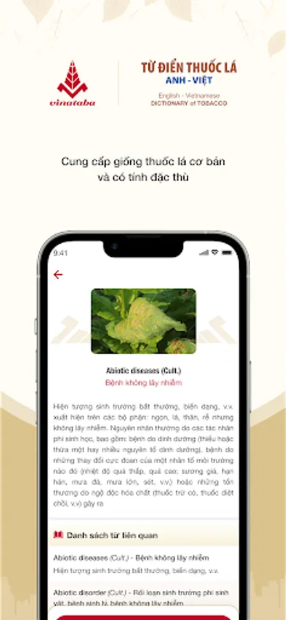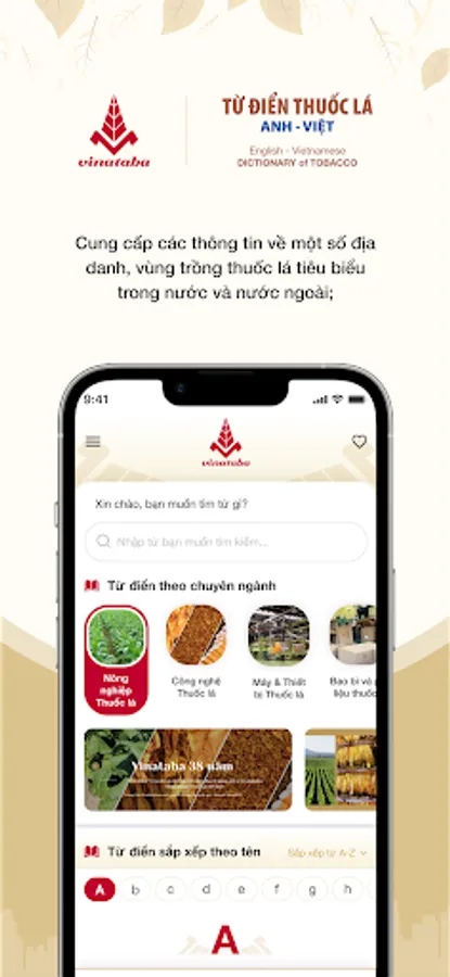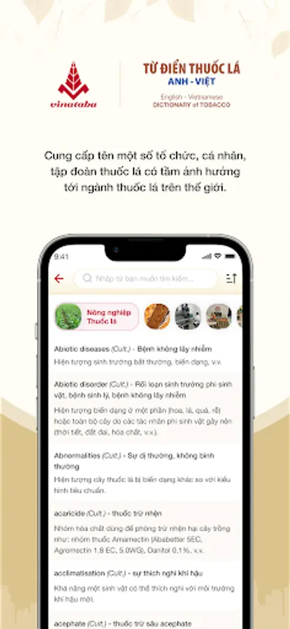 Software: English - Vietnamese tobacco dictionary, is a specialized tobacco software of Vietnam Tobacco Corporation to look up languages from English to Vietnamese, to provide knowledge about tobacco on a wide scale. vi domestically and abroad. The software has provided new information and knowledge, focusing on essential areas in the tobacco production chain such as: tobacco agriculture, tobacco technology, tobacco processing and production machinery and equipment; flavoring additives, tobacco chemistry and analysis; tobacco packaging and accessories, etc. In addition, the software also provides information about some typical places and tobacco growing regions in the country and abroad; basic and unique tobacco varieties; Names of some organizations, individuals, and tobacco corporations that have influence on the tobacco industry in the world.