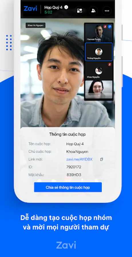 Zavi provides a solution that makes it easy to create and attend meetings. We want to connect users, help them communicate and share with each other quickly, high quality and always confidential.