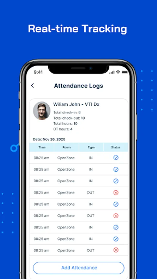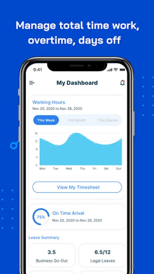 For employees, you can track your attendance in real-time, manage total time work, overtime, days off, submit schedule or create request for leave, overtime or work from home
