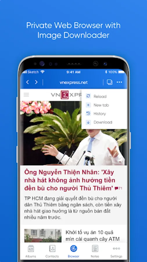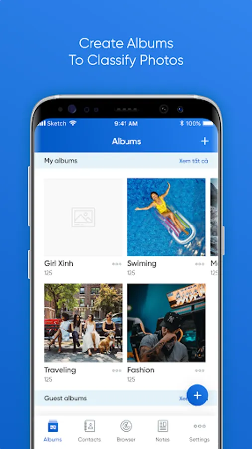 - In tab Albums: images are dowloaded from browser which will be saved in tab album. User can delete image and delete album download. Moreover, you can take photos by app for saving images in app.