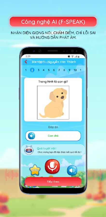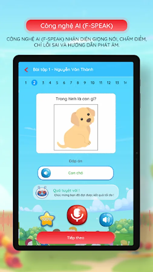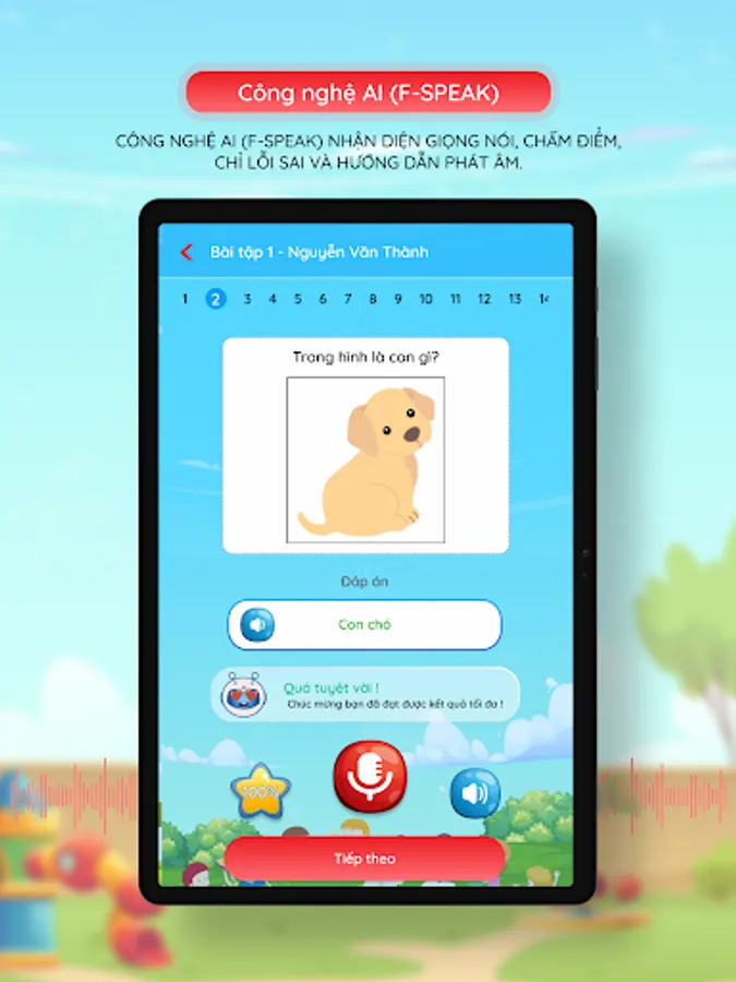 AI technology (F-SPEAK) recognizes voice, scores, points out mistakes and guides correct pronunciation.