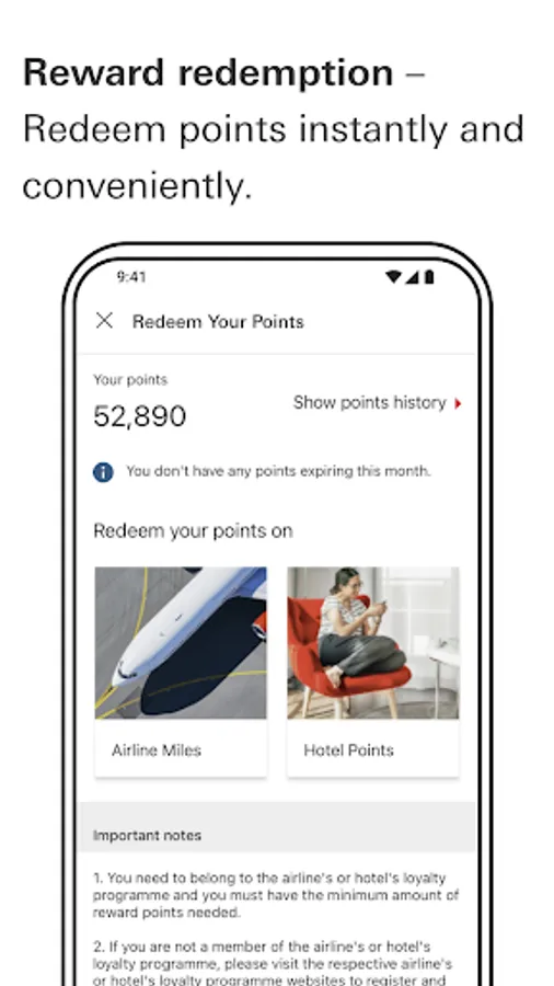 • Redeem your reward points to hotel points or airline miles instantly and conveniently.