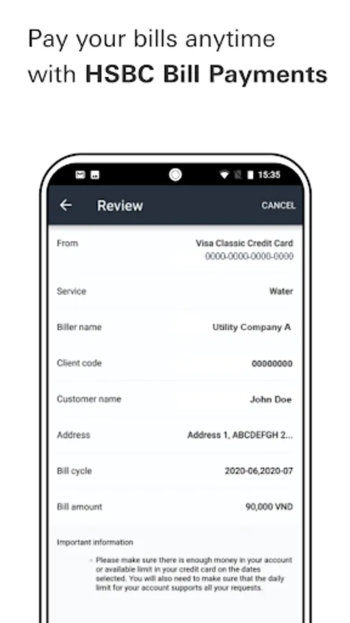 Please be aware that HSBC Vietnam is not authorised or licensed in other countries for the provision of the services and/or products available through this App. We cannot guarantee that the services and products available through this App are authorised to be offered in other countries.