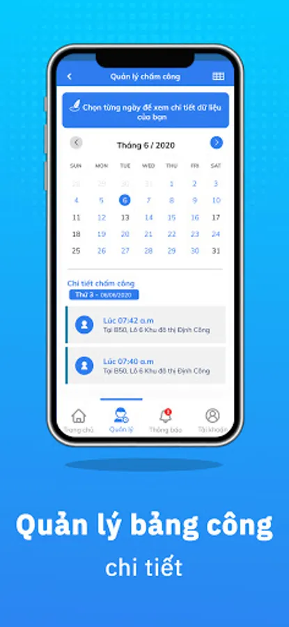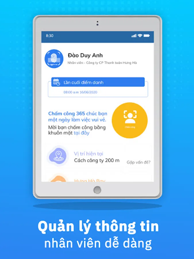 Instead of receiving fingerprints sometimes not sensitive because the sensor is not working well, the hand is too cold so the fingerprint is not clear or complicated than having to enter information to record the work, the 365 Attendance app. brings immense convenience thanks to the face detection feature. You just need to put the phone camera in front of your face, the system will recognize it to record the timekeeping for you.