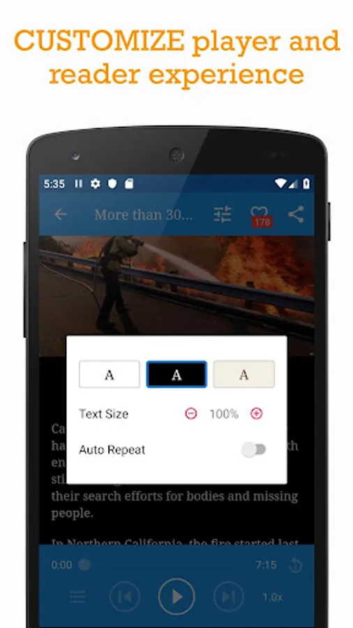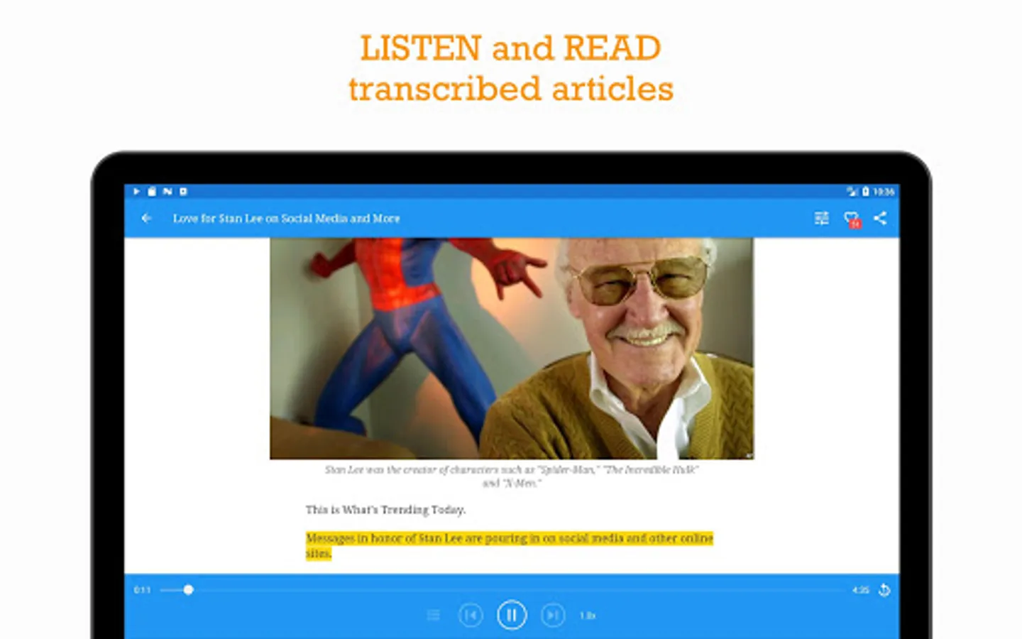 * Transcript tracking: the audio transcripts are highlighted and auto scrolled to help you focus on listening