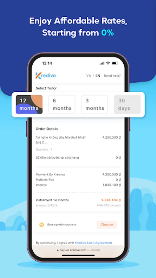 You can buy now pay later online at Sendo, FPTShop, CellphoneS, Di Động Việt, Bạch Long Mobile, Meta.vn, Hnam Mobile, Kidsplaza, Con Cưng, MyTour, Divui, Happy Skin... and choose Kredivo upon checkout. You can choose to pay in 30 days and 3-month installment in-due interest waived, or 6-month and 12-month installments with a very low interest of 3.5% per month, no down payment!