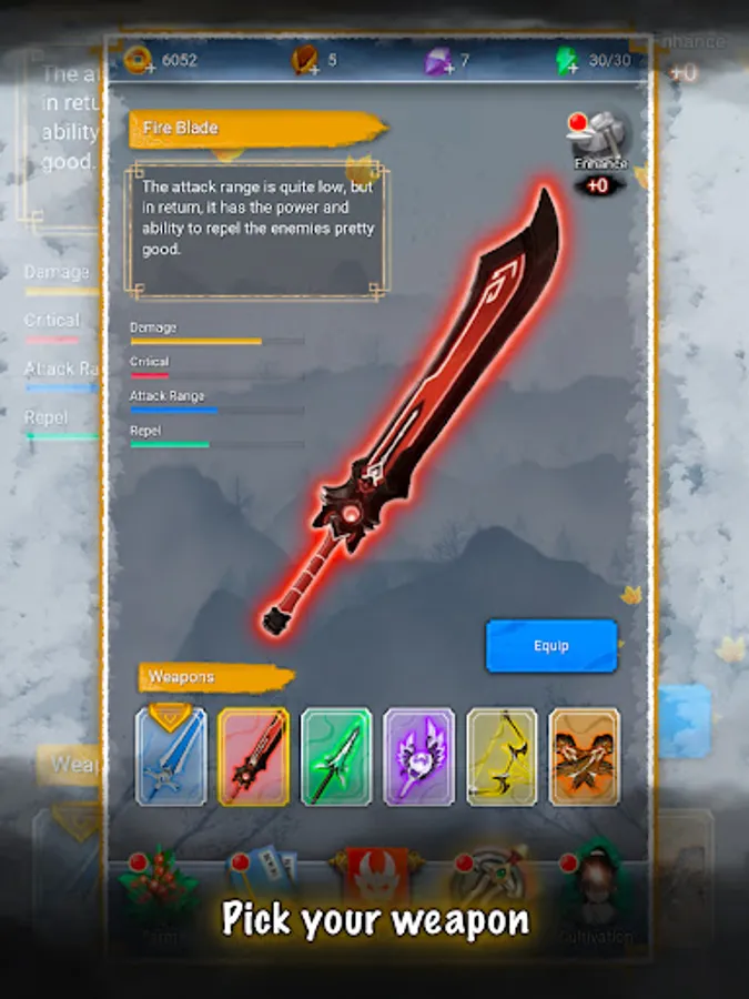 - Weapons: there are 6 types of weapons for you to choose and upgrade