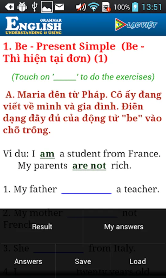 - Practical Lessons - Practice: after each lesson will have direct hands-on applications to review their knowledge, there are two forms of exercises to choose from available and typical words or phrases missing. Users can then view the results, see the correct answer, save and review exercises did.